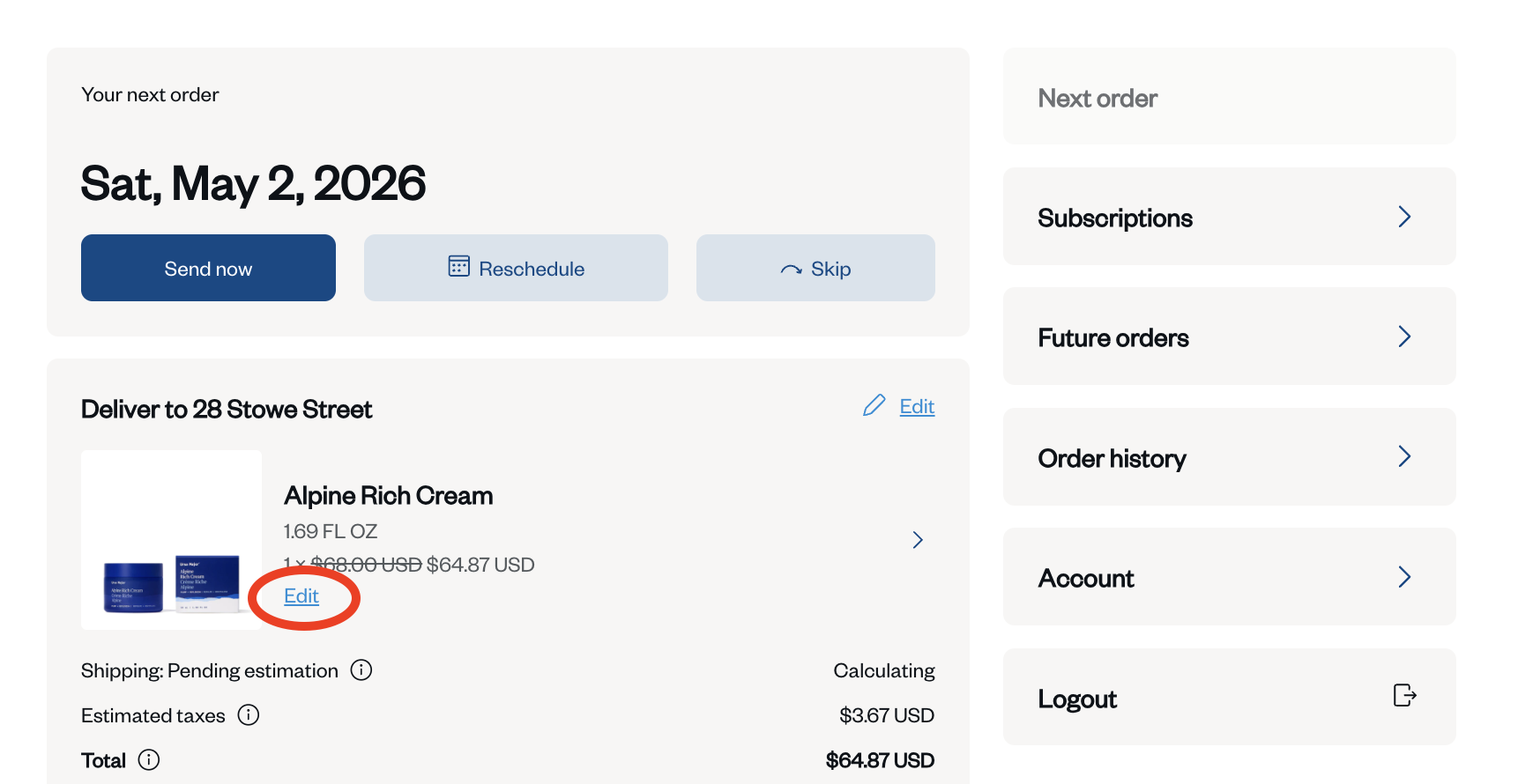 1. Access your Subscribe & Save portal, and click Edit underneath the product you are looking to swap out.